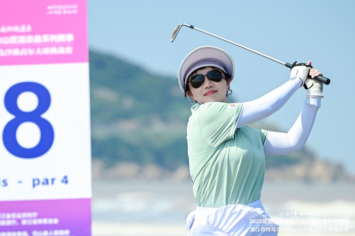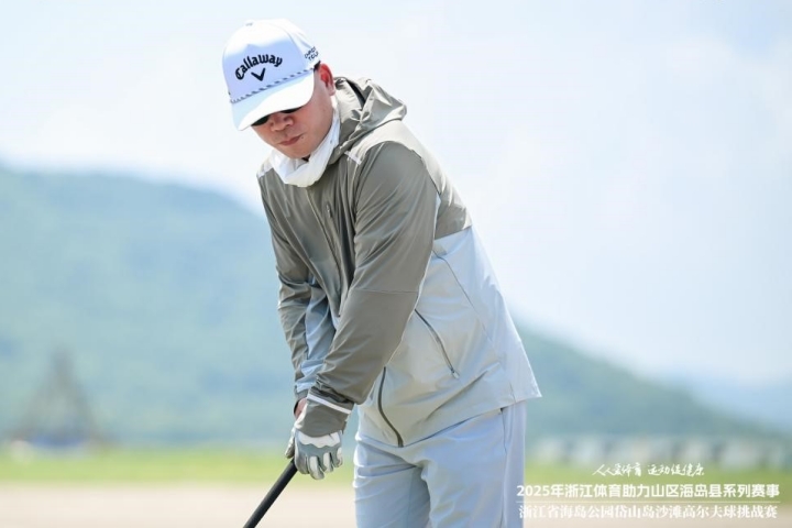 沙滩高尔夫挑战赛区别于传统绿茵球场,是浙江体育助力山区海岛县系列赛事的创新型赛事,将赛场搬至岱山岛标志性的金色沙滩——鹿栏晴沙。选手们脚踏细软金沙,背倚碧海蓝天,在具有一定挑战系数的沙滩上挥杆击球,海风成为策略考量的一部分,浪声则是最独特的背景音。