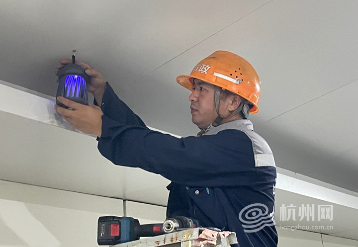 开学的脚步日益临近,杭州的城市管理服务也随之升级,为学子的上学路送上贴心关怀。8月18日下午,在保俶路和文一路交叉口的人行地道内,两名机电设备工人正忙碌地安装灭蚊灯。他们从入口通道到主通道,认真测量每一处间距,确保灭蚊灯能均匀地安装在侧壁上。