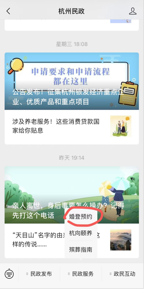 首先,需要提前2-30天通过“杭州民政”微信公众号(“民政服务-婚登预约”菜单栏)或浙里办APP搜索“浙有姻缘”进行预约,咨询电话:0571-64813876。
