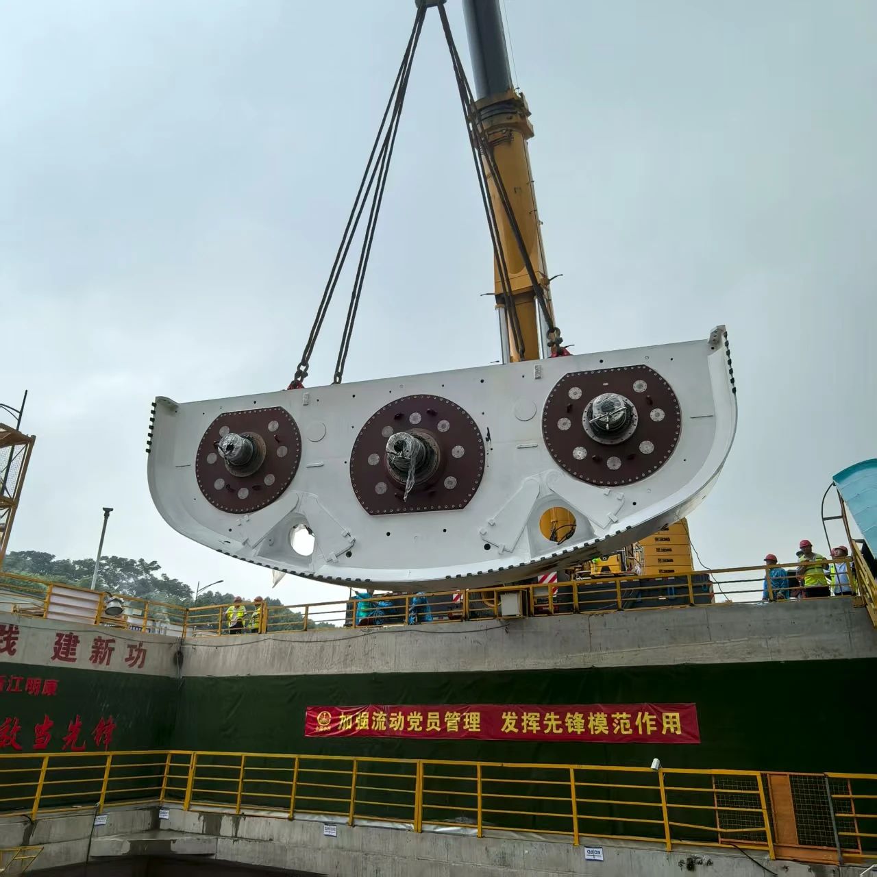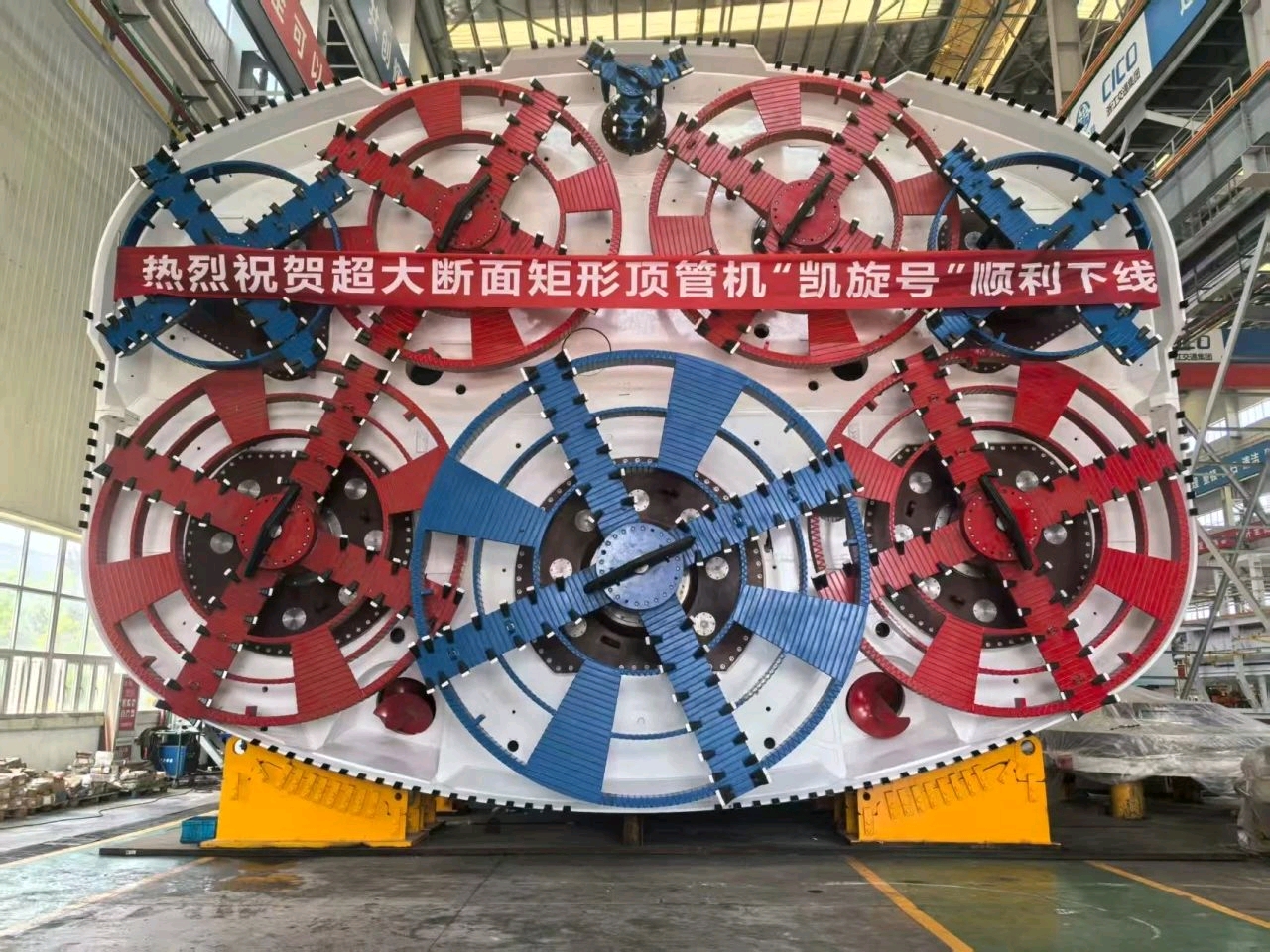 此次始发的“凯旋号”顶管机断面宽12.02米、高8.72米,整机包含开挖系统、驱动系统、盾体系统、出渣系统、顶推系统以及后配套系统等,采用4前4后多刀盘低扰动开挖设计、多螺机防喷涌密封系统设计、主驱动耐高水压设计以及适应于大埋深盾体支护系统设计等技术,是针对杭州复杂地质条件“量身定制”的“地下巨无霸”,这开创了矩形顶管机首次应用于大埋深高水压地铁停车线施工的历史先河。