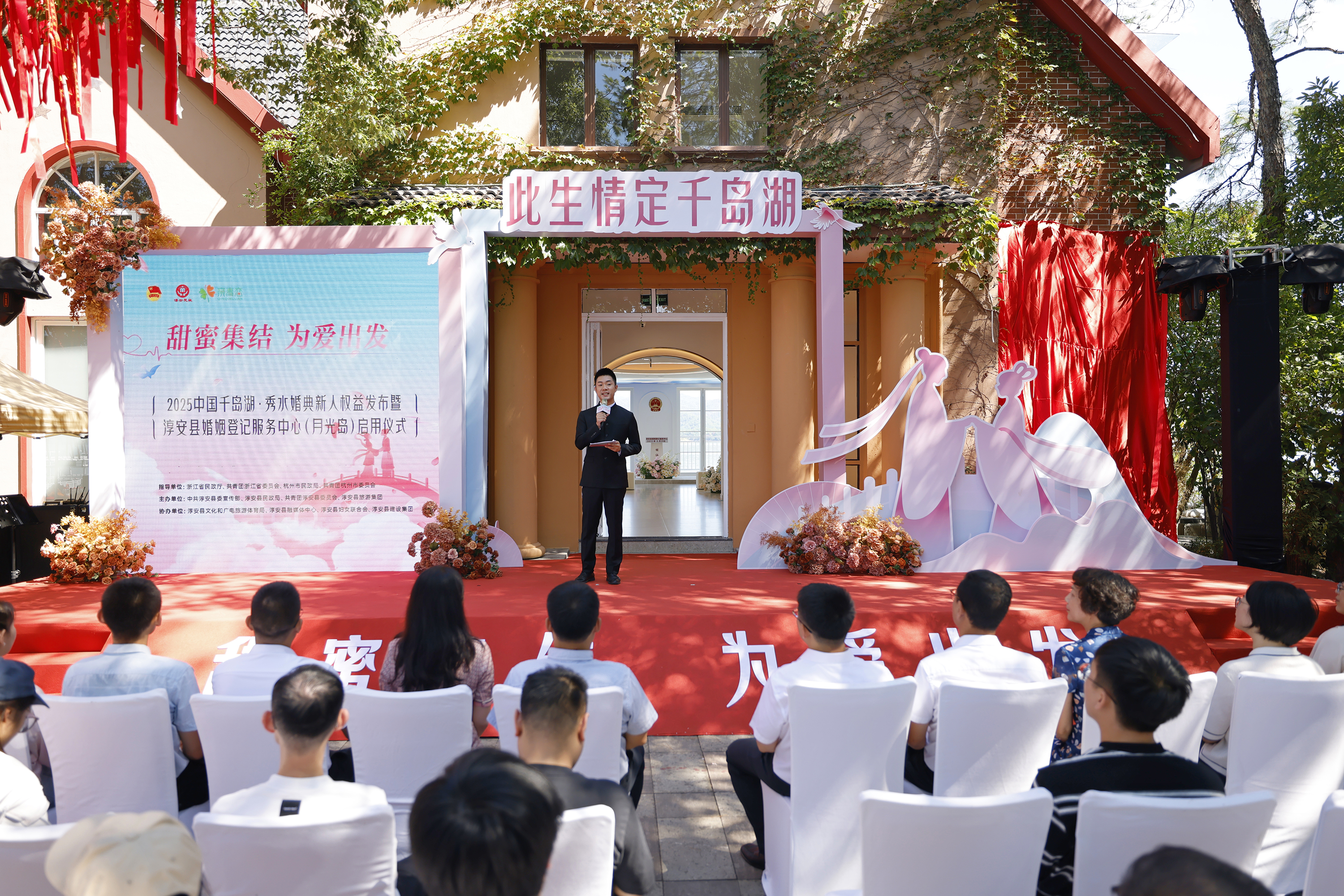 千岛湖碧波荡漾,月光岛犹如一颗明珠镶嵌在千岛湖畔。月光岛一直是千岛湖内著名的爱情岛,岛上的情园更是著名的“锁岛”,见证了无数游客的甜蜜。在“甜蜜集结为爱出发”2025中国千岛湖·秀水婚典新人权益发布暨淳安县婚姻登记服务中心(月光岛)启用活动现场,发布了“亲青恋·青友学院”青年交友新阵地、户外颁证基地、四项婚旅政策和2025中国千岛湖·秀水婚典新人权益,新人代表为全国首个湖泊岛屿婚姻登记服务中心——淳安县婚姻登记服务中心(月光岛)揭牌。新人唐赣和妻子相识已经十年,他们特地选择在这片湖光山色中领结婚证。“我非常开心,能见到这么美的景色,希望一家人日子过得越来越好,越来越幸福。”唐赣的话语里满是激动和憧憬。