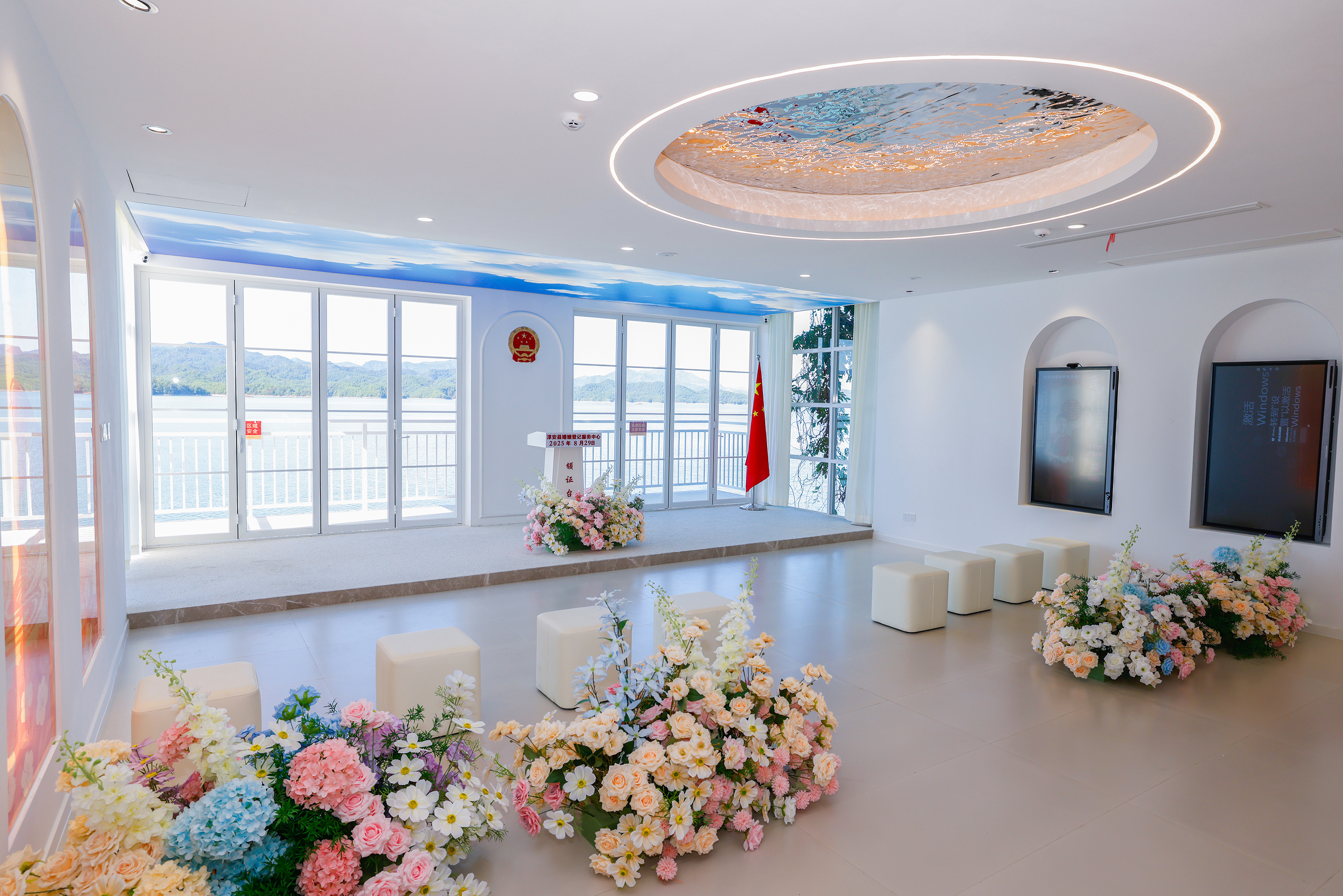 8月29日,七夕节,千岛湖月光岛迎来了一场特殊的“甜蜜揭幕”——全国首个湖泊岛屿婚姻登记服务中心在此正式启用。一对对“牛郎织女”相继走进婚登中心,或是奔赴分布在各处的户外颁证基地,在山水见证下,许下相守一生的诺言。