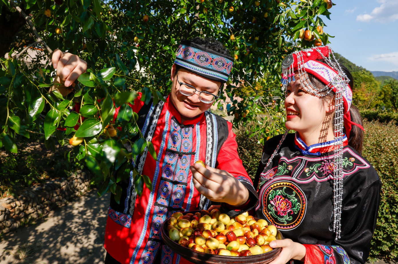 在此次活动中,56个民族服饰美+山水美,备受新人青睐。左口乡显后村成片的枣树林郁郁葱葱,枝头上挂满了硕大饱满的南枣,红得诱人,甜得沁心。“枣枣”遇见你、“枣”生贵子,这些饱含美好寓意的“枣文化”,让这片历经岁月沉淀的古枣树林,成为新人们争相打卡的爱情秘境。王至柔夫妇便将旅拍的目的地选在了这里,他们身着畲族传统服饰,衣袂上“凤凰戏牡丹”的精美纹样在阳光下熠熠生辉,一步步走向“爱情地标”显后村的枣树林。古枣树下,光影交错,相机快门声不断,一张张唯美的旅拍照片,将他们的幸福定格成永恒。