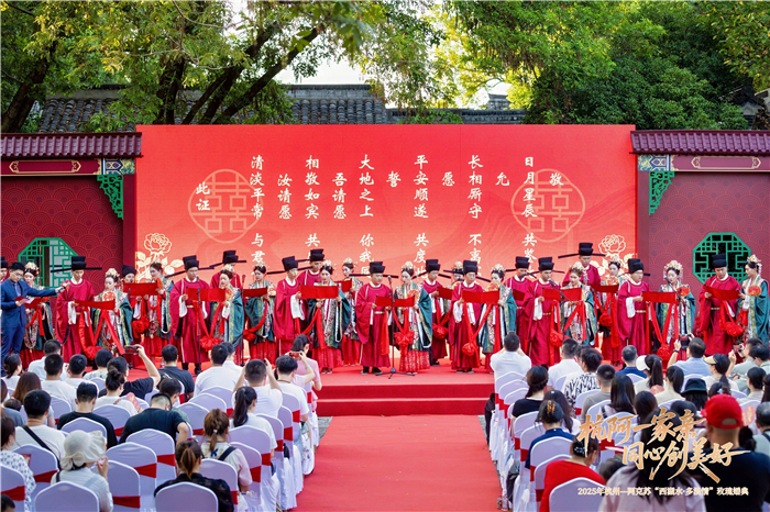 典礼开始前,新人们体验了别具特色的水上迎亲环节,在西溪湿地如诗如画的美景中,感受杭州作为历史文化名城的独特韵味。后续,阿克苏新人还将前往良渚博物院、杭州亚运会博物馆等地参观,游览西湖胜景,领略杭州的城市风貌和创新活力。
