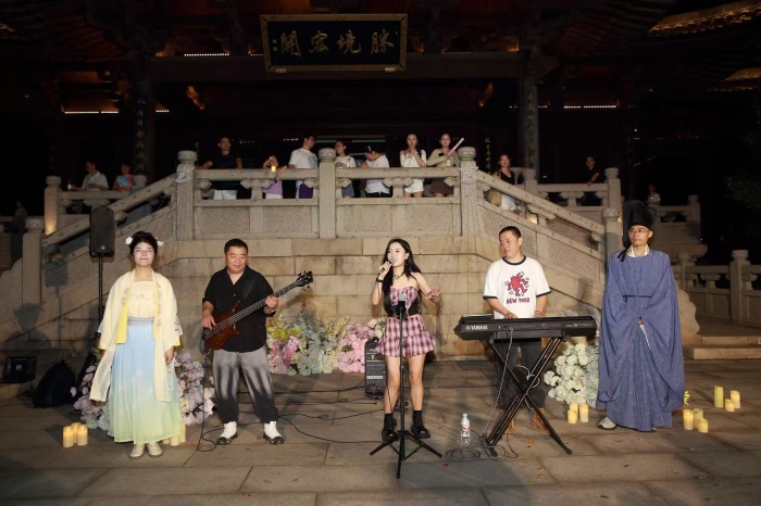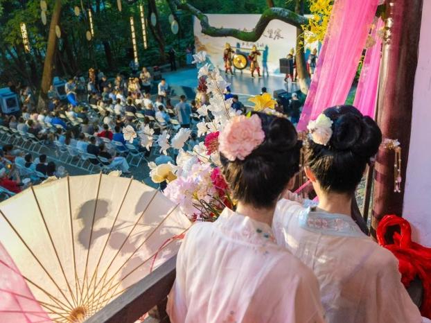 当 “爱在七夕 情定望宸” 活动的序幕待启,吴山艺术团以一场沉浸式实景演绎,将千年前宋时市井的热闹与雅致,悄然晕染在半山的夏夜之间 。“哐 — 哐 —”锣声响起,只见皇城司四人抬锣、统领敲锣,伴随演员扬声吆喝 “开市喽,今日无税!”那喊声清亮如檐角风铃,瞬间唤醒了古市集的鲜活气息,让人恍若站在临安街头。随后一场灵动优美的开市舞蹈压轴登场,舞姿翩跹间,拉开了“爱在七夕 情定望宸”活动的浪漫序幕。