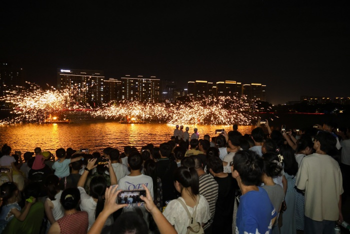 七夕之夜的金沙湖畔,爱的旋律处处涌动。空中水上飞人技艺与非遗火壶表演刚柔并济,既展现爱的美学,也让传统民俗变得可感可及;腾空而起的无人机表演融合国风与科技元素,在夜空中勾勒浪漫图景,放飞“但愿人长久”的美好祝福。