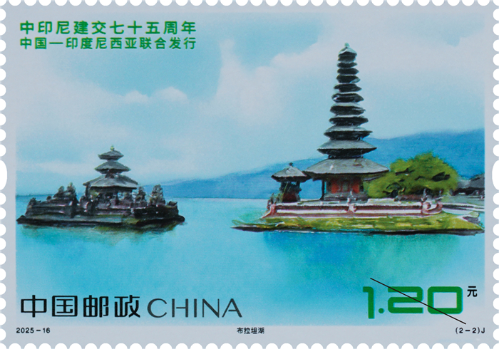 邮票第二图表现内容为布拉坦湖。布拉坦湖是印度尼西亚巴厘岛上著名的标志性景观之一,也是当地的主要灌溉水源,形成于火山口上,山水灵秀,景色清幽,天气凉爽,周围建筑融合了不同风格,优雅精致,历史悠久,深受游客喜爱。