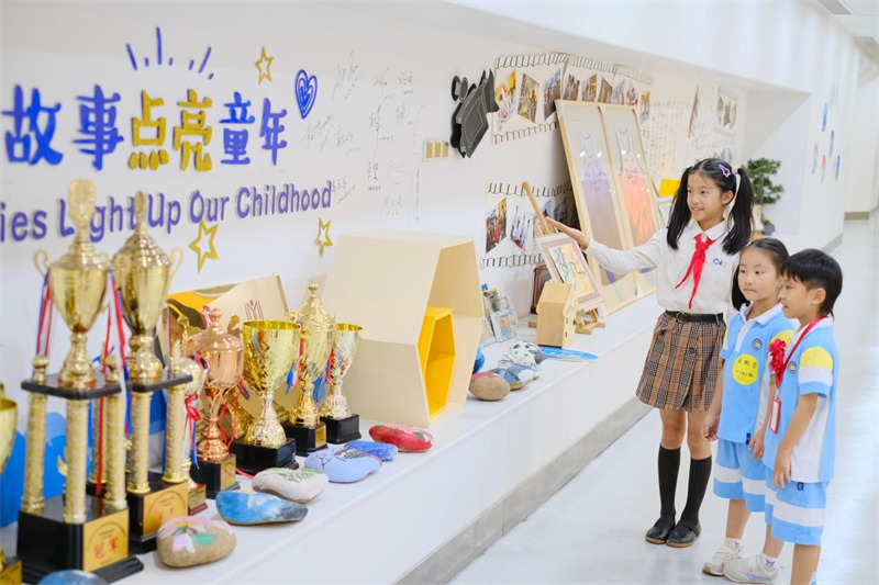 高年级孩子带一年级“小萌新”参观学校荣誉墙