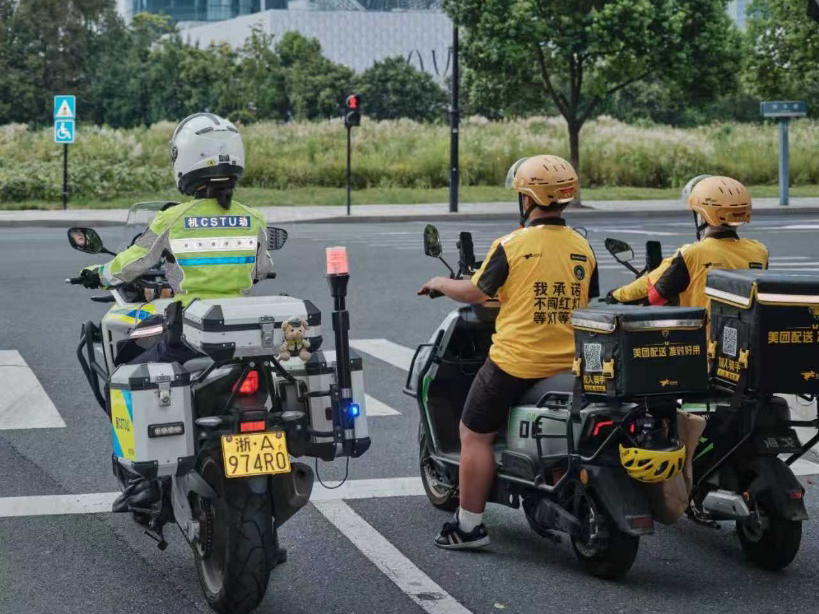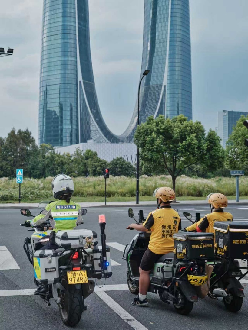 活动期间,美团还为骑手定制了印有“不闯红灯”标语的外卖服。在杭州的繁忙路口,一抹抹黄色身影耐心等灯,逐渐成为一道别致的“安全风景线”。一位骑手感慨:“这句话既提醒自己,也提醒路上的每个人。”