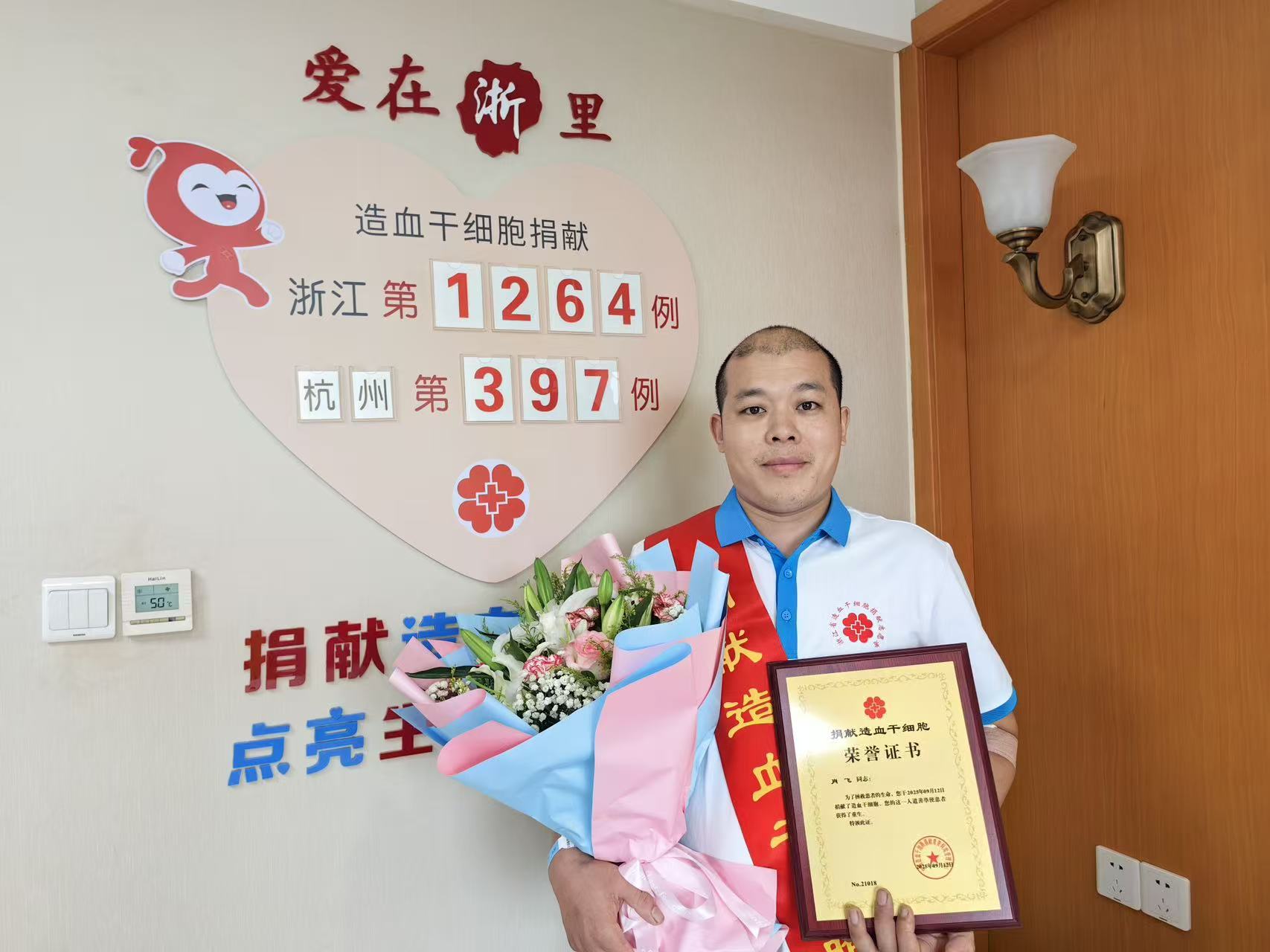 9月12日,在杭州某造血干细胞采集室内,一场充满爱与希望的生命接力正在温馨上演。经过五个多小时的采集,40岁的肖飞成功完成了258毫升造血干细胞悬浮液的采集,成为浙江省第1264例、杭州市第397例造血干细胞捐献者,为一位陌生患者送去了重生的希望。