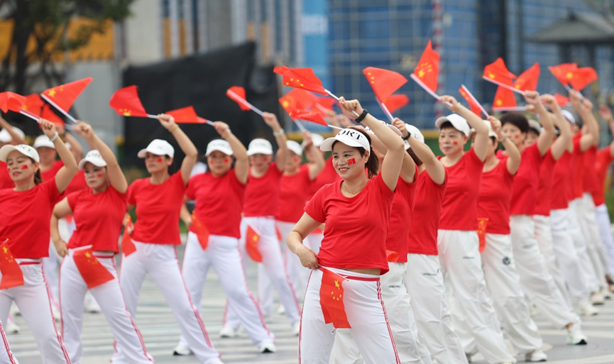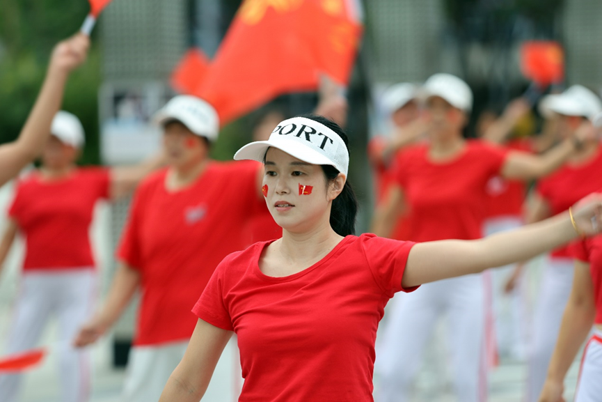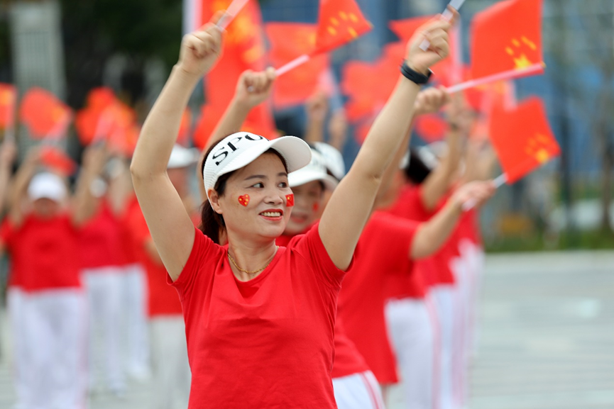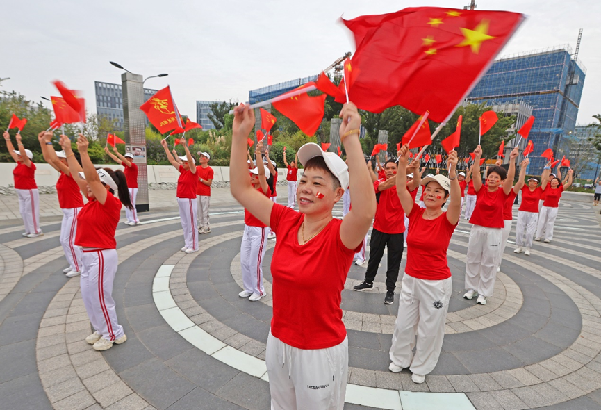 “今天是你的生日,我的中国……”熟悉的旋律响起,领操的幼儿园燕红老师动作舒展有力,她身后的队伍里,开饭馆的赵大姐挥动红旗时笑容格外灿烂。虽然大家的动作未必完全标准,但每个人脸上都洋溢着节日的喜悦。