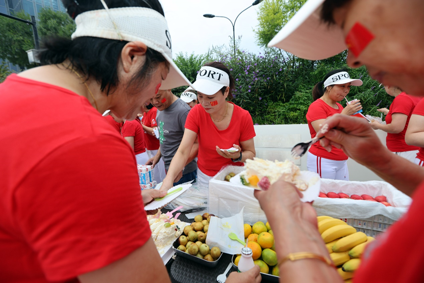 不到五点半,天边刚泛起鱼肚白,领队萍姐就已经到公园忙碌起来了。她面前的长条桌子上摆满了新鲜的葡萄、香蕉、西瓜等各种水果饮料,其中最醒目是一个为祖国庆生的方形大蛋糕。