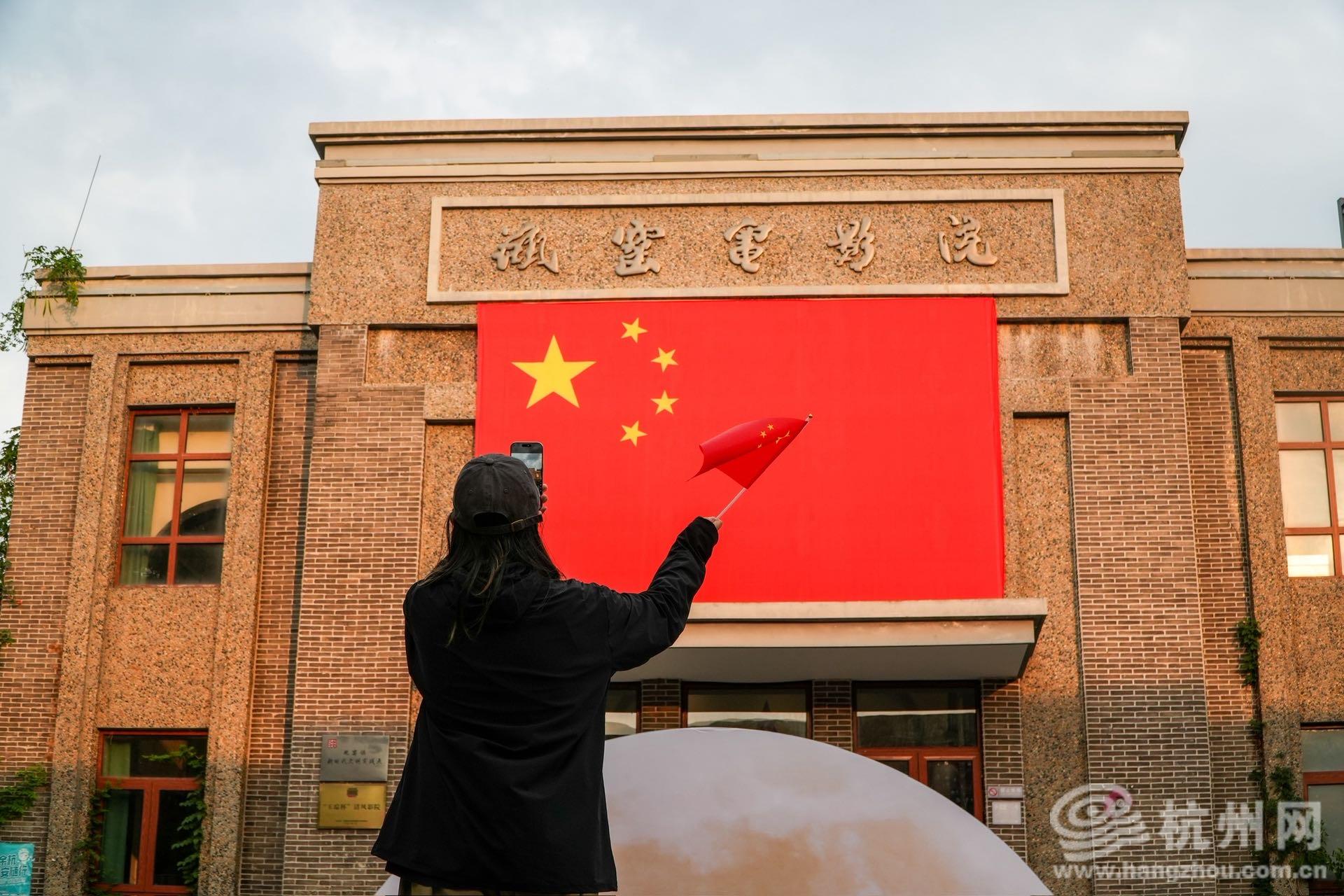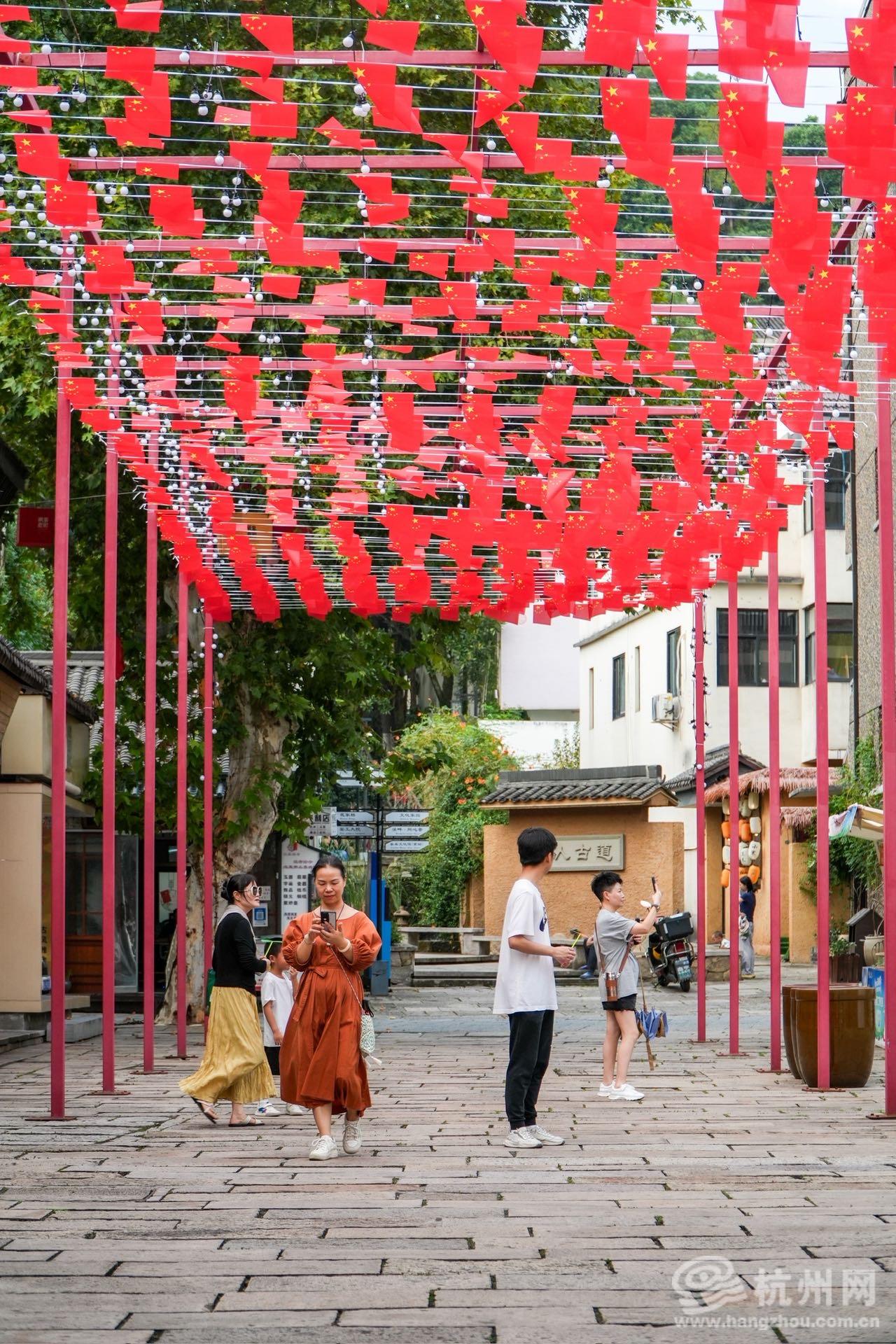 在闲林埠老街,古街同样洋溢着浓厚的节日氛围。闲来吾市市集和小吃街上,一串串鲜艳的国旗高高悬挂,为古朴街巷增添了昂扬朝气。特别是郭家台门前那面5米高的巨幅国旗,与古色古香的建筑相映生辉,传统与现代在这里完美融合。