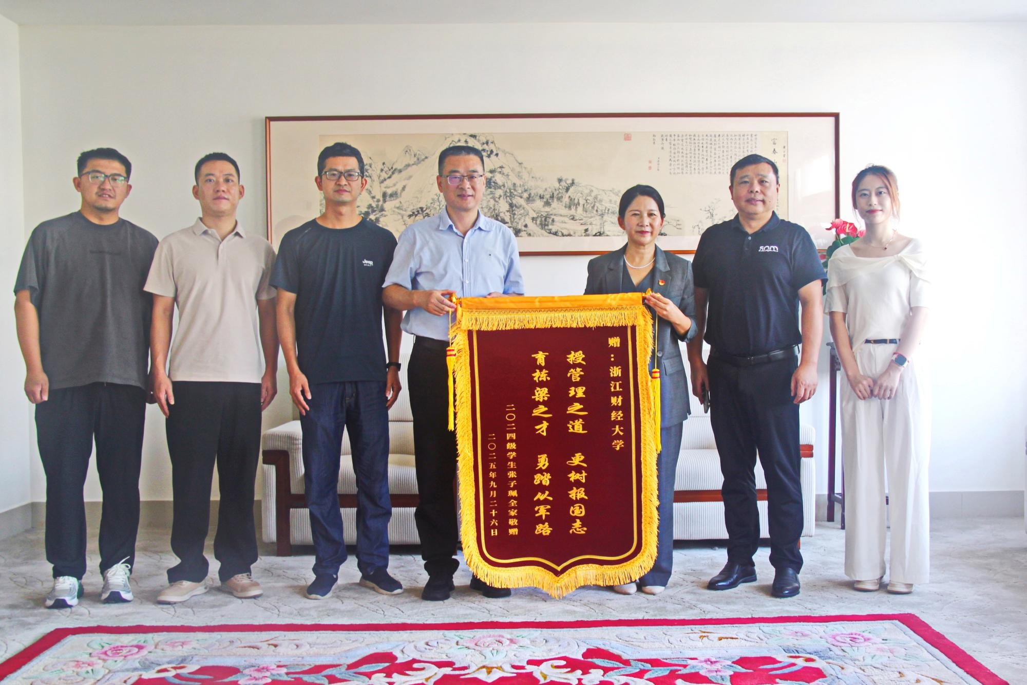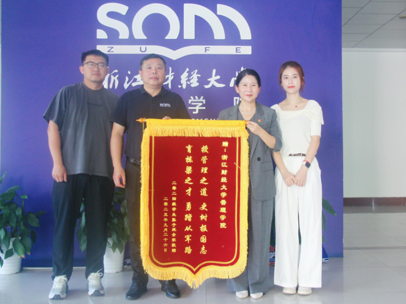 “授管理之道,更树报国之志;育栋梁之才,勇踏从军路。”近日,浙江财经大学管理学院2024级市场营销(中外合作办学)专业学生张子珮的家长王萍专程从河南老家来校赠送锦旗。“感谢学校让子珮实现了参军报国的梦想!这面锦旗代表我们全家的心意,也是一位河南家长对学校育人工作的真诚认可。”