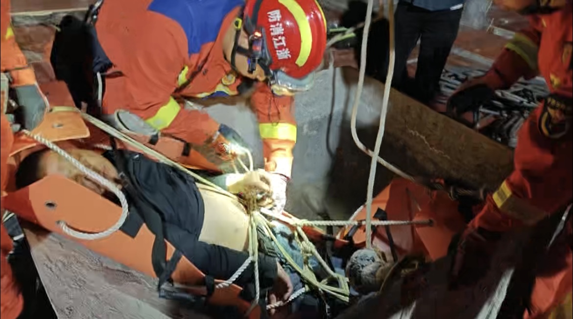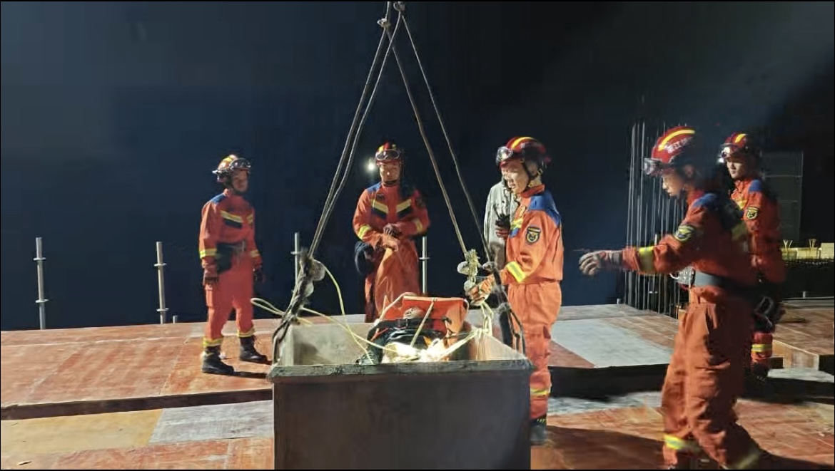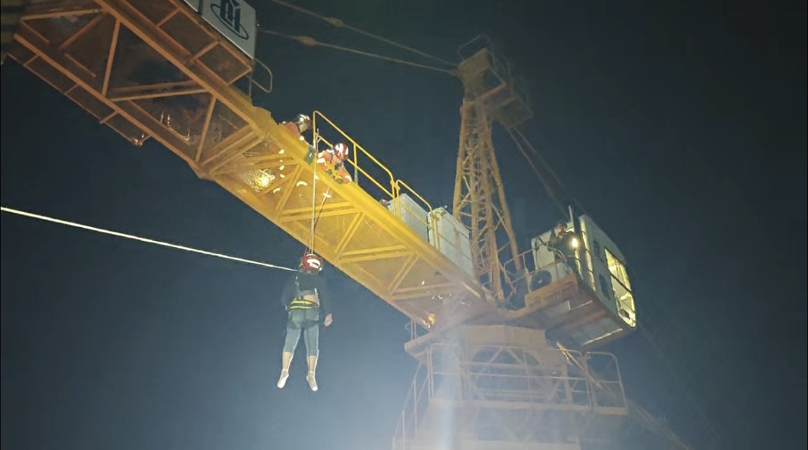 救援行动随后进入关键阶段:地面队员精准操控预设牵引装置,高空队员全程护送,先将被困司机从塔吊驾驶室转移至旁边建筑的楼顶;紧接着,利用工地塔吊将地面的兜吊设备升至楼顶,再通过塔吊将昏迷司机平稳转运至地面。