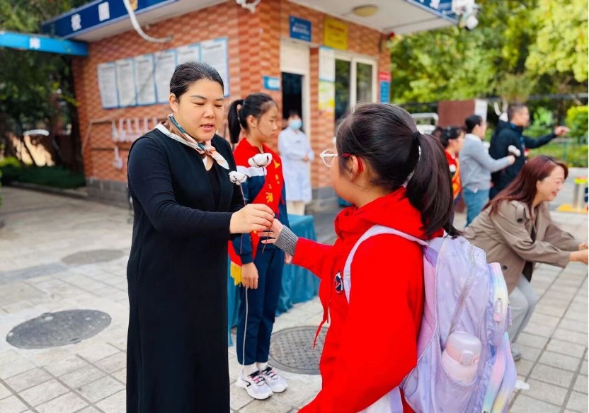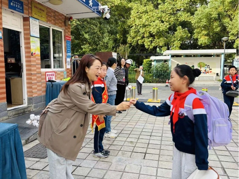 清晨的风里,徐小慧书记、张燕校长带领校领导班子早早守在校门口,手中捧着雪白的棉花。“你主动问好的样子真有礼貌,这朵棉花送给你!”徐书记笑着把棉花递到小朋友手里;张校长轻轻揉了揉小同学的小脑袋:“要一直做懂礼貌的好孩子!”