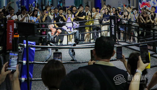 机器竞技。2025年9月25日,第四届全球数字贸易博览会现场,一场紧张刺激的“机器人格斗赛”引爆现场。