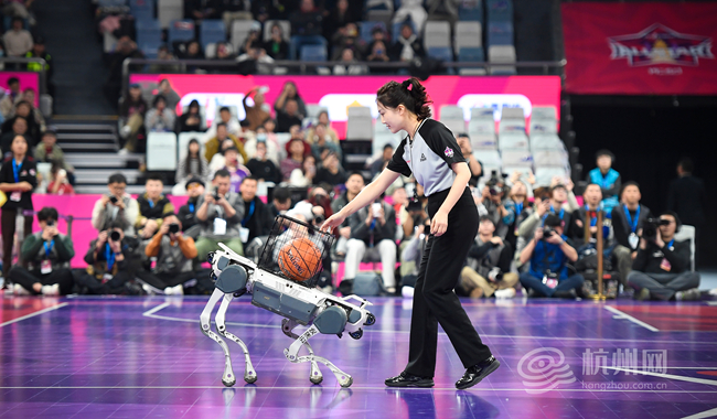 赛事智服。2025年2月23日,WCBA全明星正赛上,机器狗更化身服务小能手,为球员送比赛球、为粉丝送礼物,引得现场笑声不断。