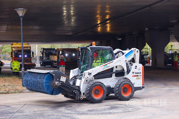 灵活清雪,打通狭窄节点:在模拟匝道积雪场景中,滑移装载机展现出在狭窄区域的高度灵活性,通过快速换装滚刷等属具,高效完成推雪、扫雪等一体化作业。