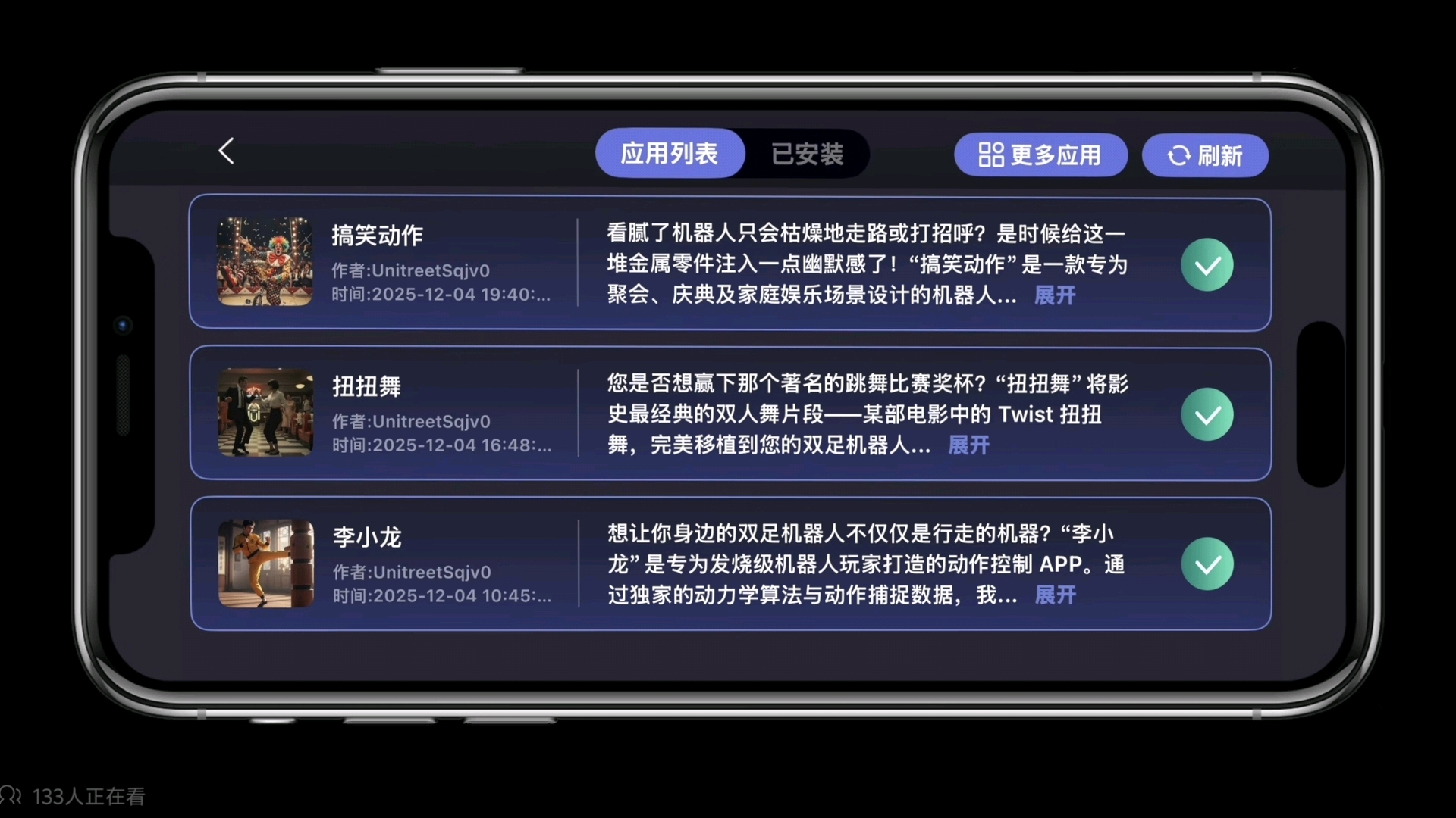 12月13日,宇树科技宣布首发人形机器人“App Store”,用户可将训练好的舞蹈、武术、劳作等模型一键上传分享,也能下载其他开发者开发的动作部署到机器人终端。