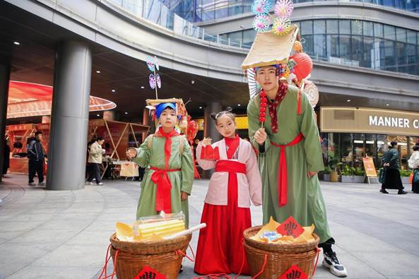 活动现场,一幕幕热闹场景诠释着“丰景”内涵。一楼主广场上,“丰收市集”汇聚35个展位,非遗手作、便民服务、书画交流琳琅满目;“扁担郎”穿梭叫卖,唤醒老街记忆;儿童行李箱集市则让萌娃化身“小店长”,在交换分享中播下友爱种子。