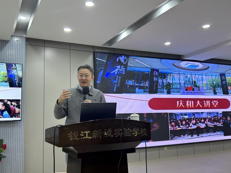 “我们都知道恐龙是一种神秘的生物,如果我问大家恐龙是人类的远亲,大家觉得这种说法对吗?”12月29日下午,杭州市钱江新城实验学校“庆和大讲堂”如期开讲。中国科学院院士、著名古生物学家徐星教授,为同学们带来了主题为《飞向蓝天的恐龙》的科普讲座。