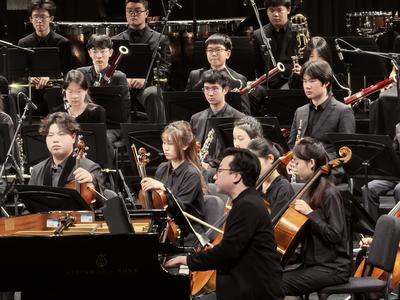 莫扎特《第十双钢琴协奏曲K.365》则由附中副校长吴晓、钢琴主科教师陈在田联袂呈现。这是莫扎特唯一的双钢琴协奏曲,两台钢琴在音符间彼此倾听、相互托举,与乐团形成严密而自然的呼吸关系。这里既有成熟演奏者对结构与风格的从容把控,也有学生乐手的信任与成长,仿佛一种无需言说的默契——师生在同一音乐语境中彼此理解、共同完成,而舞台也成为最直观的教学现场。