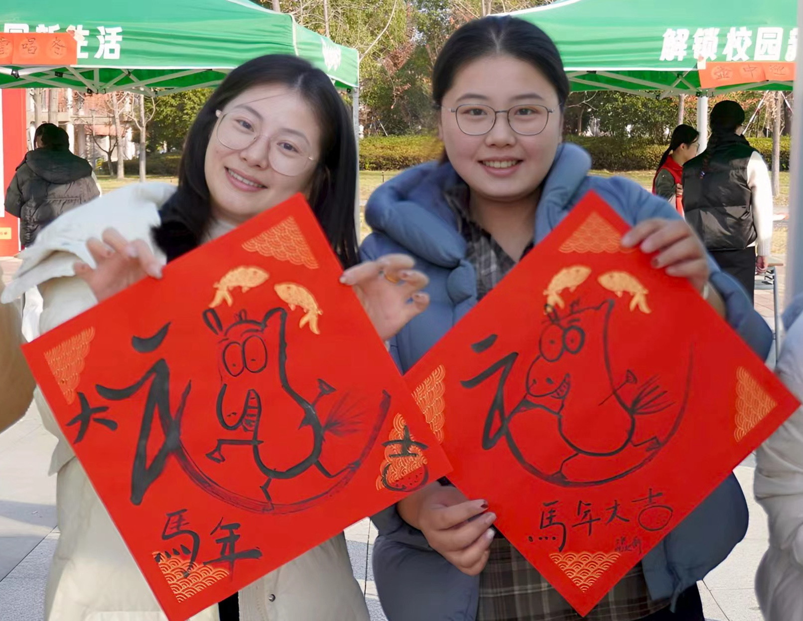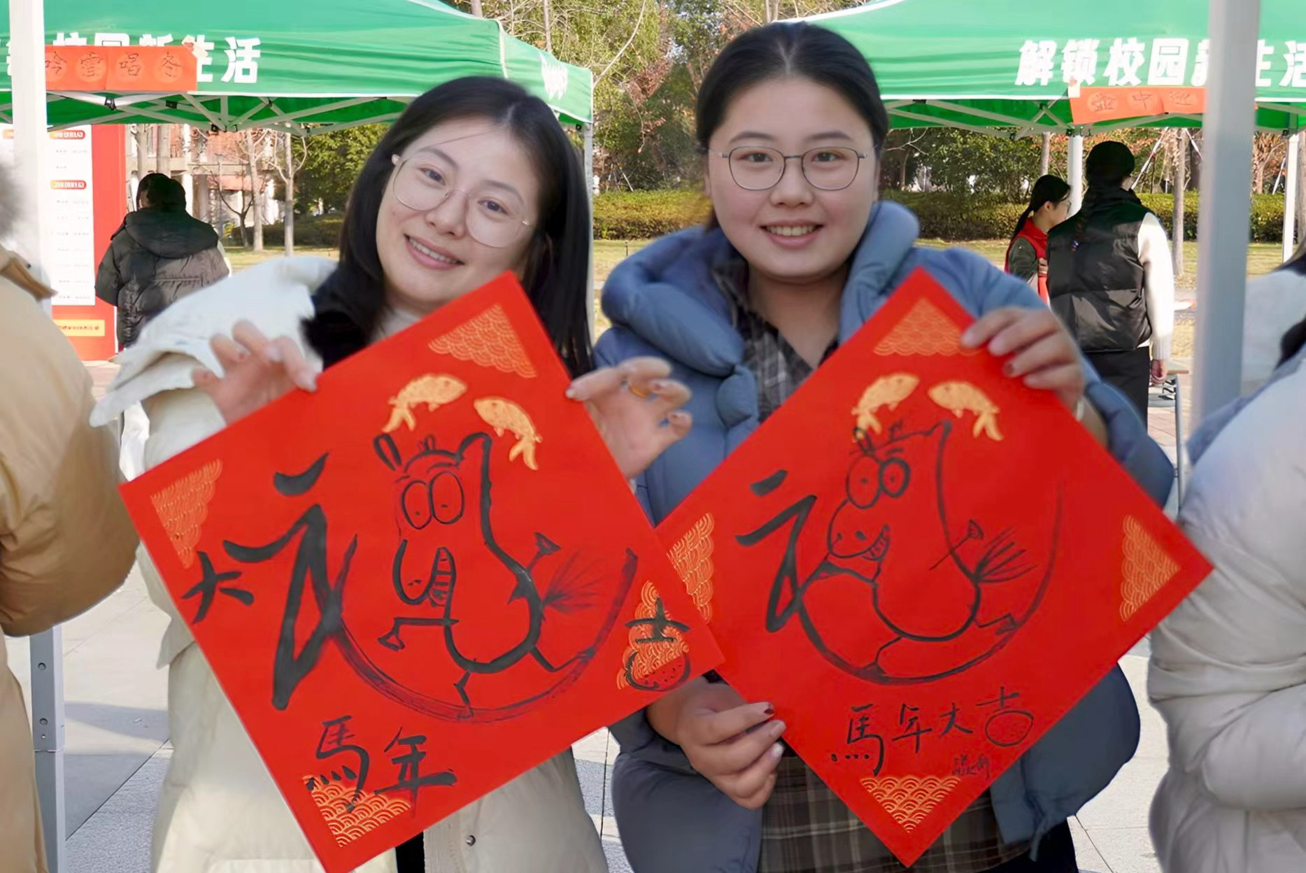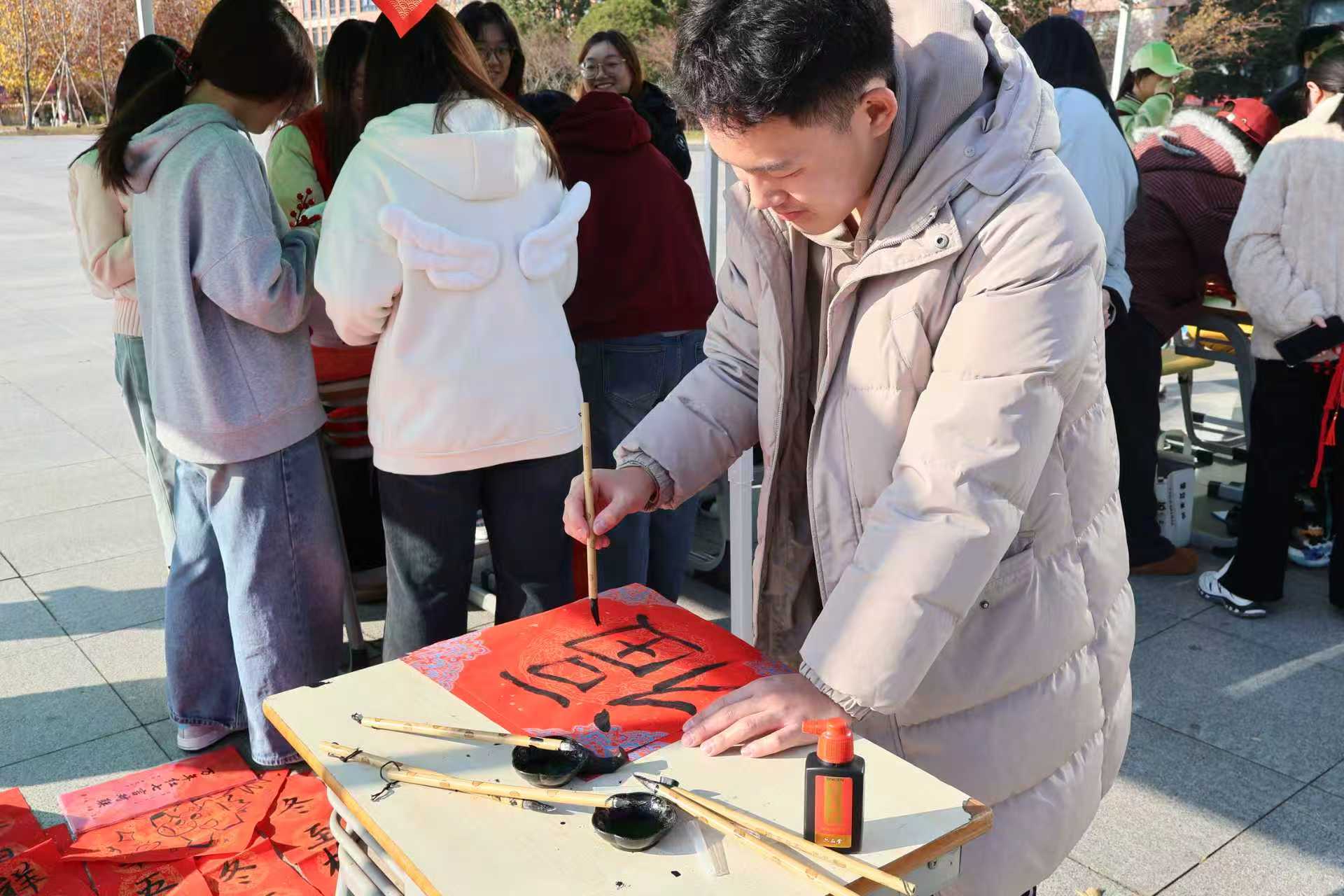 笔墨送福区更是人气爆棚。“我要写个大福字讨彩头!”一名同学蘸满浓墨,挥毫写下饱满大气的“福”字,刚落笔就收获一片夸赞。现场墨香阵阵,学子们书写春联、福字,还不忘在福字旁添上可爱生肖图案,举着作品拍照打卡。