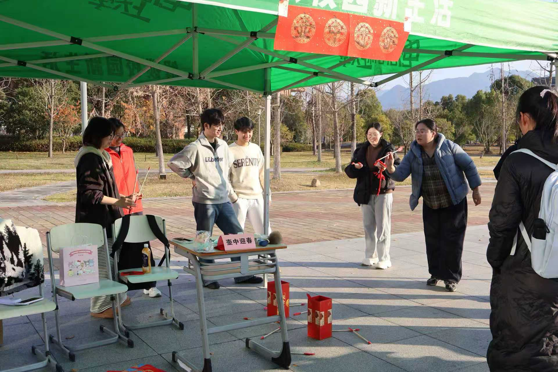 “中啦!”投壶区域传来阵阵欢呼,杭商院国贸2301史馨颖的精准投掷,引得围观同学喝彩不断。作为源自先秦的传统游戏,投壶被赋予了新年新意——现场划分2米新手区、3米高手区,搭配仿古壶具和安全软胶箭,壶身还贴着“元旦安康”“岁启纳福”等吉祥语。