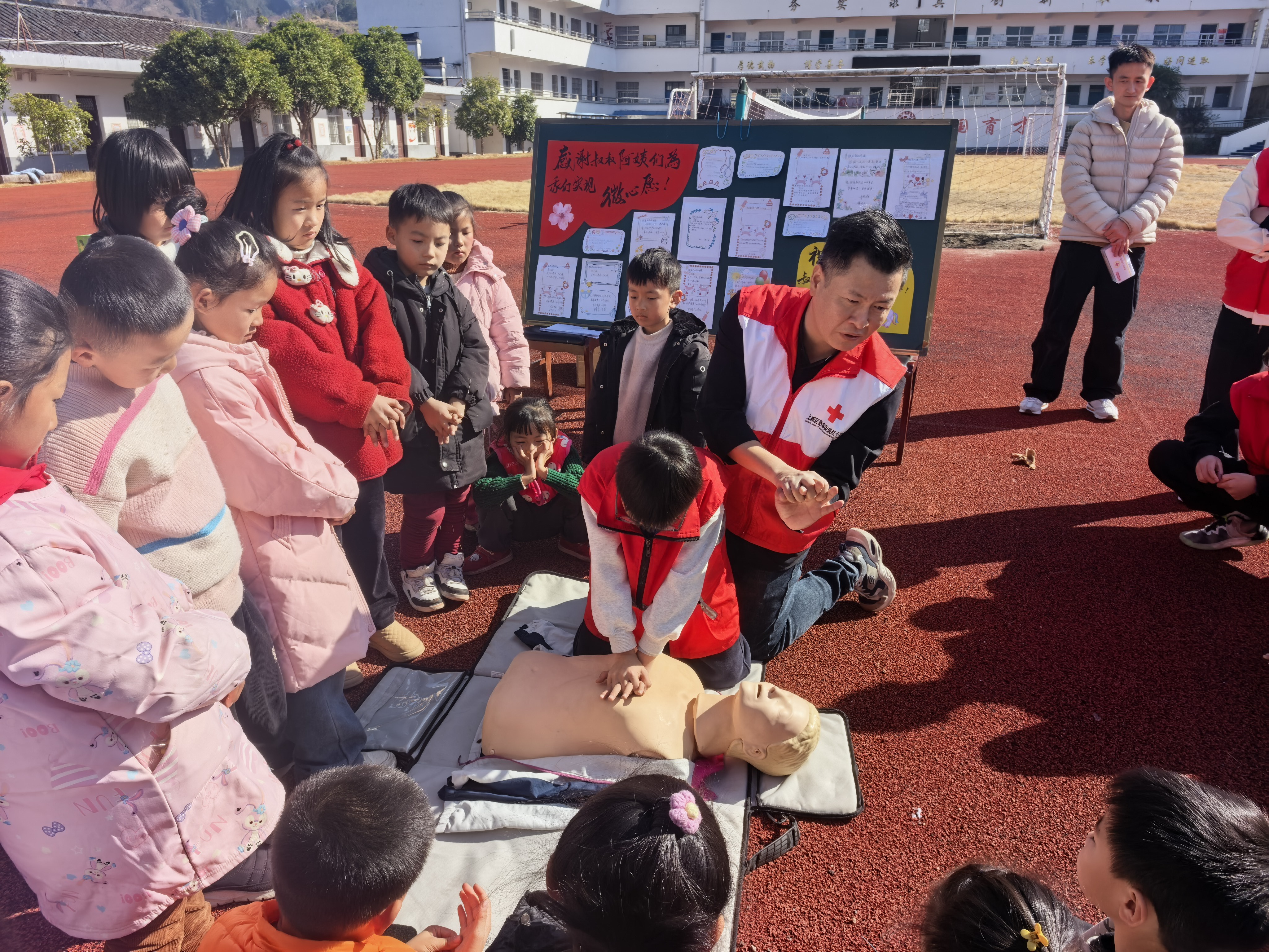 物资发放后,爱心服务仍在继续。上城区红十字会救护培训师张军为孩子们带来一堂生动的应急救护课,细致讲解心肺复苏、烫伤溺水等急救知识,并通过情景模拟引导孩子们实践操作。连续两年参与活动的杭州市钱学森学校学生李启胜说:“希望这里的小朋友也能学会保护自己、帮助他人。”