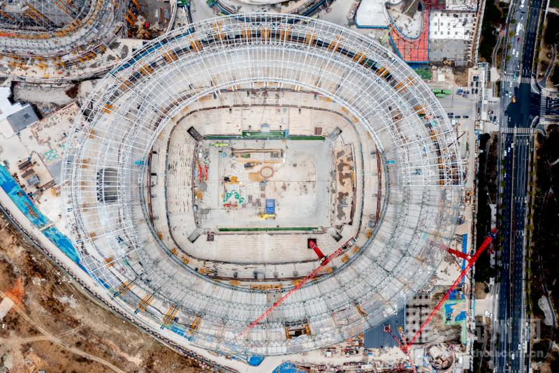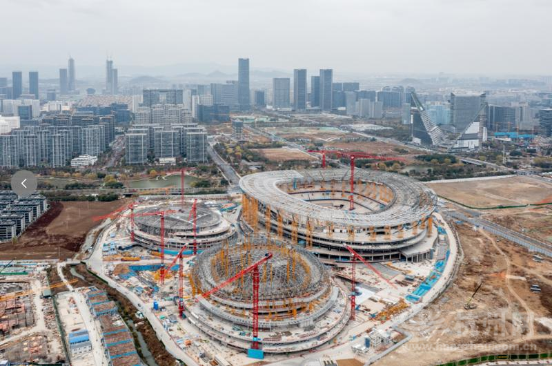 据了解,余杭国际体育中心项目坐落于杭州市余杭区,作为浙江省“千项万亿”重大工程之一,建筑南北跨度约326.92米,东西跨度约269.80米,不仅是省内首个超6万座的专业足球场,更是世界跨度最大的轮辐式双层索膜结构专用足球场。