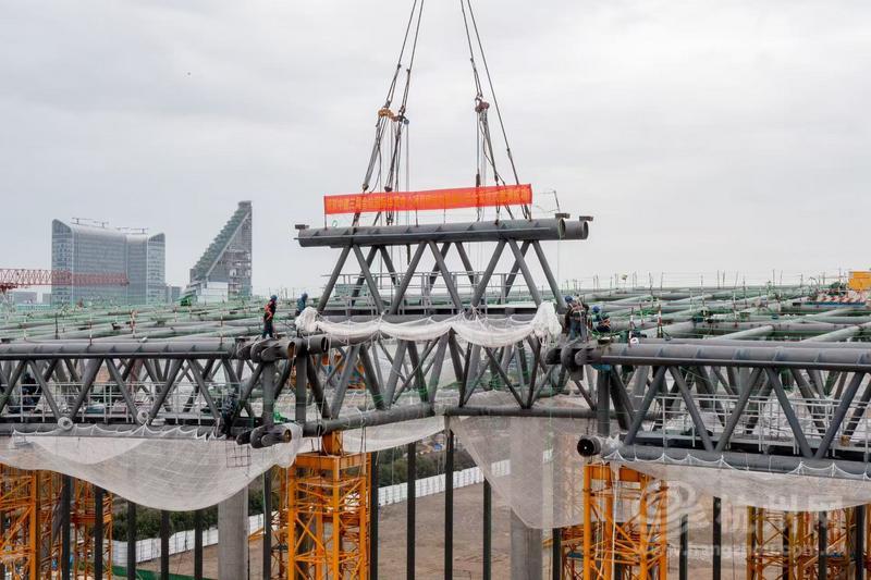 自项目今年屋盖桁架首吊作业启动以来,施工方中建三局项目团队科学制定施工部署,仅用时3个月便高效完成西区屋盖桁架安装任务。后续施工阶段,团队创新采用多区域同步推进的作业模式,持续加快施工进度,最终较原定计划提前半个月实现屋盖全面合龙。