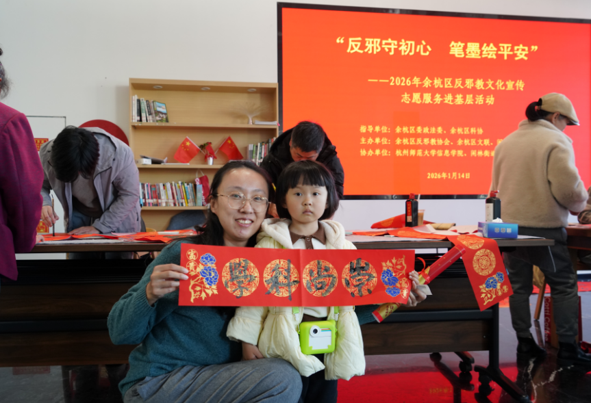 据了解,此次活动是余杭区落实浙江省反邪教协会、浙江省文学艺术界联合会相关要求的具体举措,旨在将反邪教工作与基层文化艺术活动深度融合。余杭区反邪教协会负责人介绍,相较于传统展板、宣讲等“被动灌输”式宣传,书法艺术更贴近群众生活,能让反邪理念在文化浸润中自然传递,实现“主动参与”。