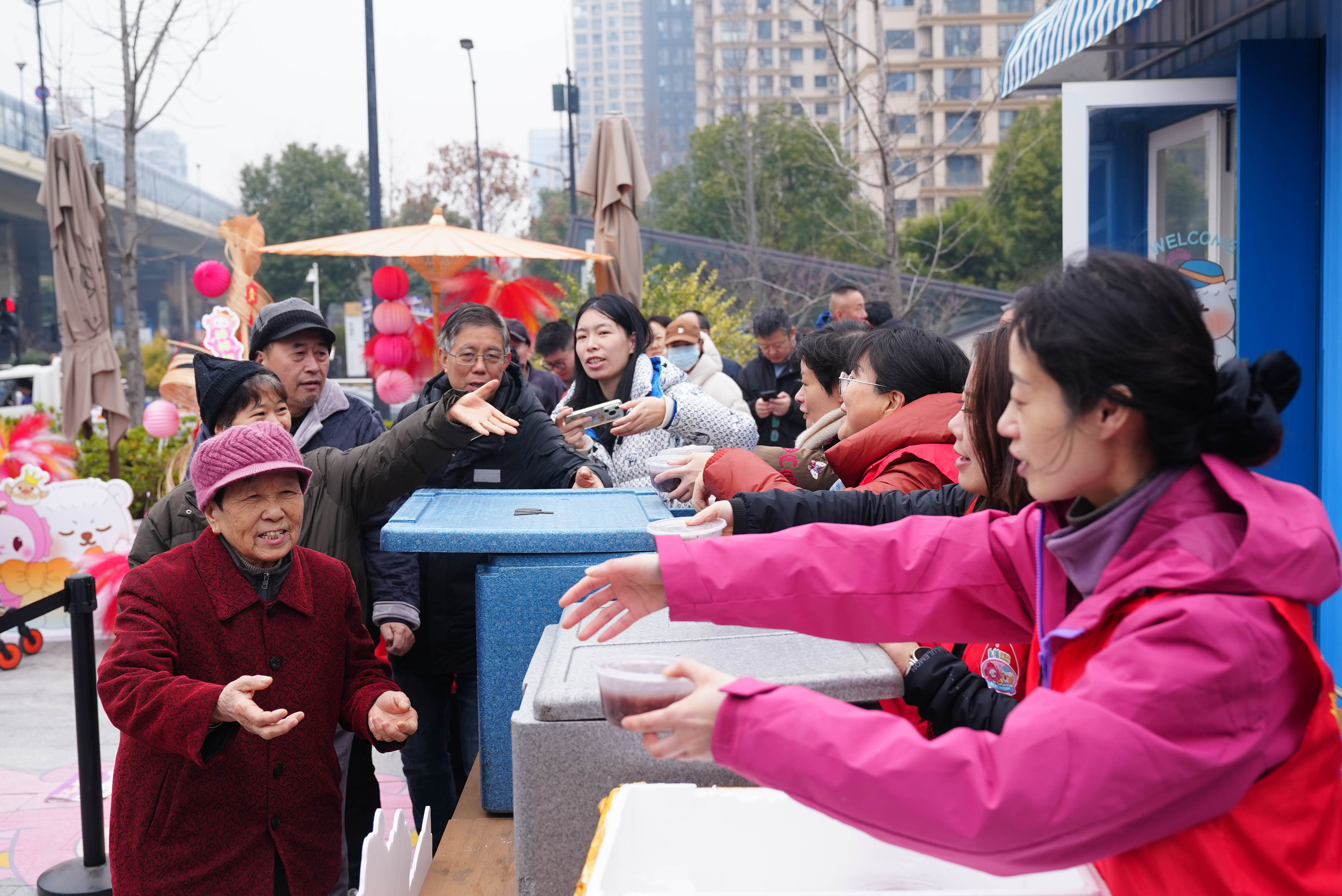 觅糖·好运集中央的“好运暖心站”前也早已排起长队,社区志愿者与侨联代表共同为辖区老人、环卫工人、快递小哥等一线工作者送上热腾腾的腊八粥。“能提前喝上一碗腊八粥,真是从里暖到外。”驿站里,正在休息的环卫工张师傅捧着粥碗,脸上洋溢着笑容。据悉,“好运暖心站”是本次年货节特别设置的公益环节,旨在向默默守护城市运转的“城市守护者”表达敬意与关怀。