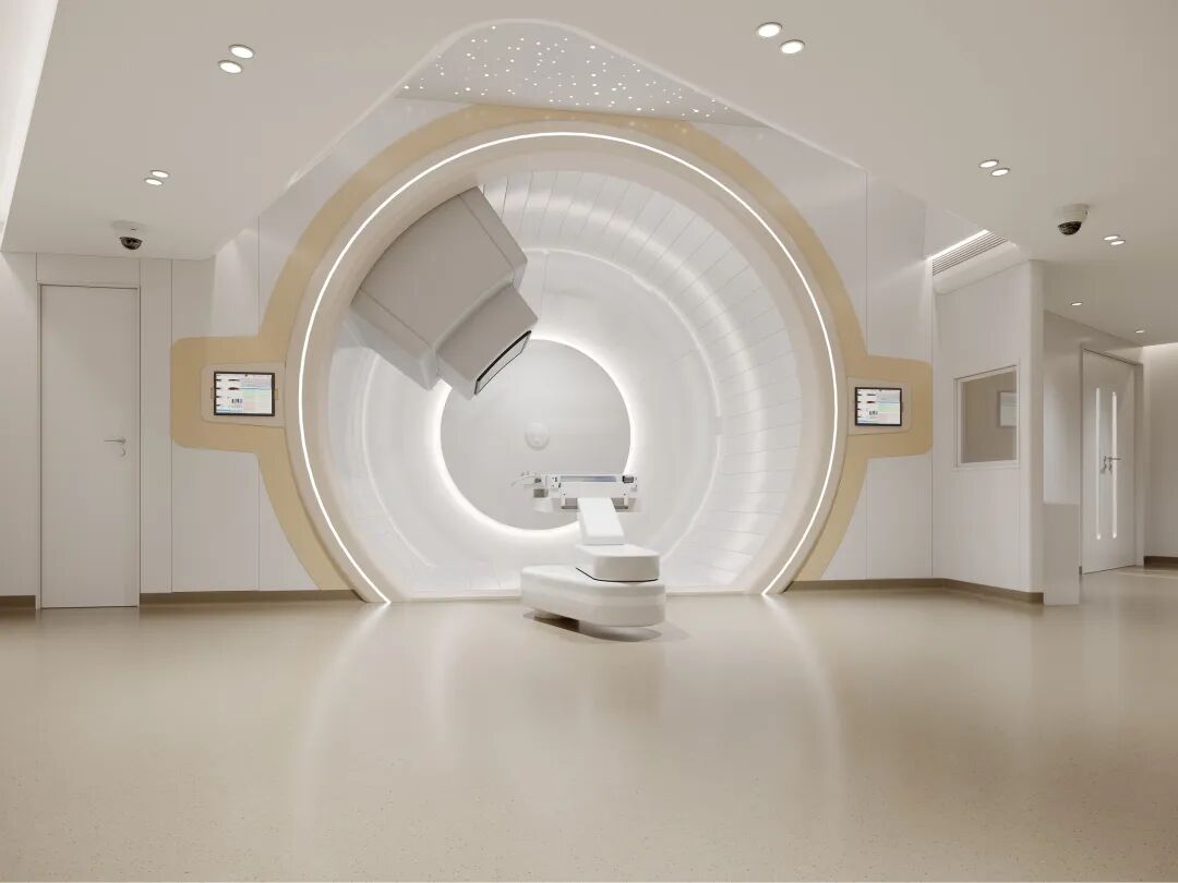 该质子治疗中心将配套国际先进的360°旋转束质子治疗系统及相关医疗功能区域,包含直加治疗区(内设直线加速器、CT、MR、PET等先进定位设备)、日间化疗中心及门诊等用房,旨在为患者提供以质子治疗为核心的全程化、便捷化、精准化“一站式”诊疗服务,通过优化流程缩短住院时间,最大程度提升患者就医体验。这套质子治疗系统采用加速器与治疗室分隔的分体式布局,相较于单机一体式结构,具有辐射影响小、束流品质高等鲜明优势。