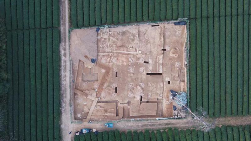 汉六朝时期建筑基址整体坐落在越国建筑基址之上,新揭露一组建筑基址历经多次营建,整体面宽近36米、进深约10米,面积约360平方米,由多组东西向础板和圆形立柱构成。配套多条地下排水设施。