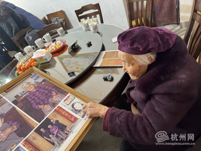 在这个相框下,是家人们的照片,“这张是我奶奶年轻时候的,”汪荷琴的孙子郑升奎指着一张黑白照介绍,“50多岁。”还有一张百岁照。照片上的汪荷琴穿着紫红色的衬衫,抱着重孙,一脸笑容。