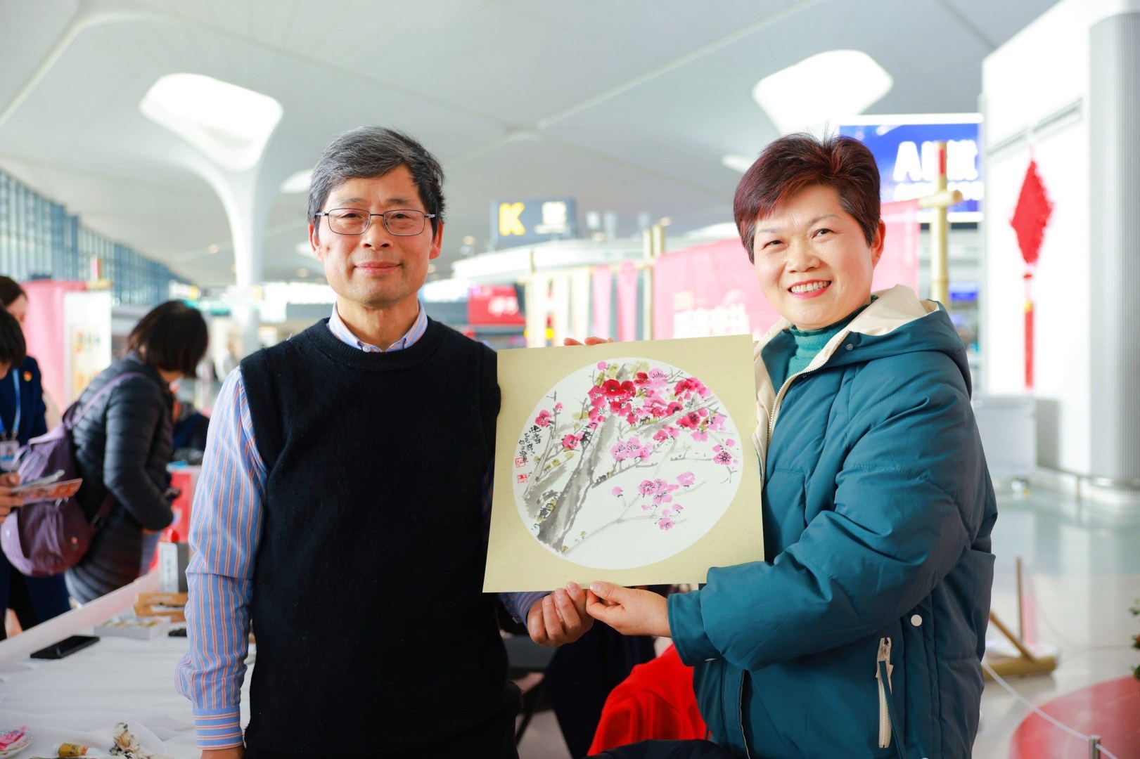 在T4出发大厅,“文化暖冬行——农民画展暨新春市集”集中展示着多幅由本地艺术家创作的乡土题材书画作品,色彩浓郁、情感质朴。旅客还可以在体验区制作漆扇、漆画,沉浸式感受非遗魅力。