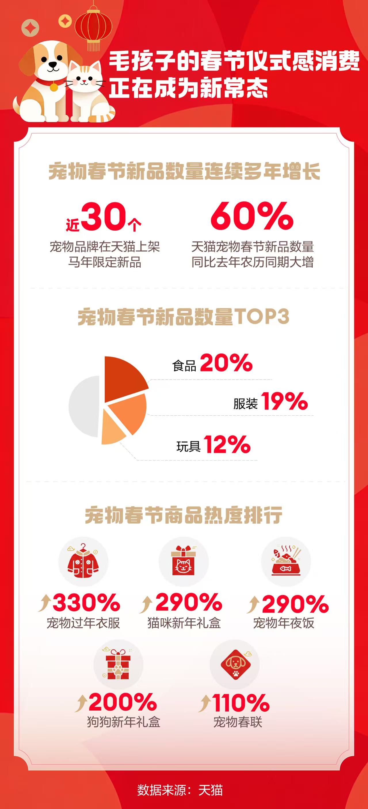 离春节还有半个月,杭州的不少铲屎官已经开始为家里的“毛孩子”置办年货:红色小马针织马甲、印着“八方来财”的宠物饺子礼盒、迷你春联……过年不光人要热闹,猫猫狗狗也要仪式感拉满,这股风潮正越来越旺。