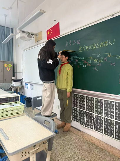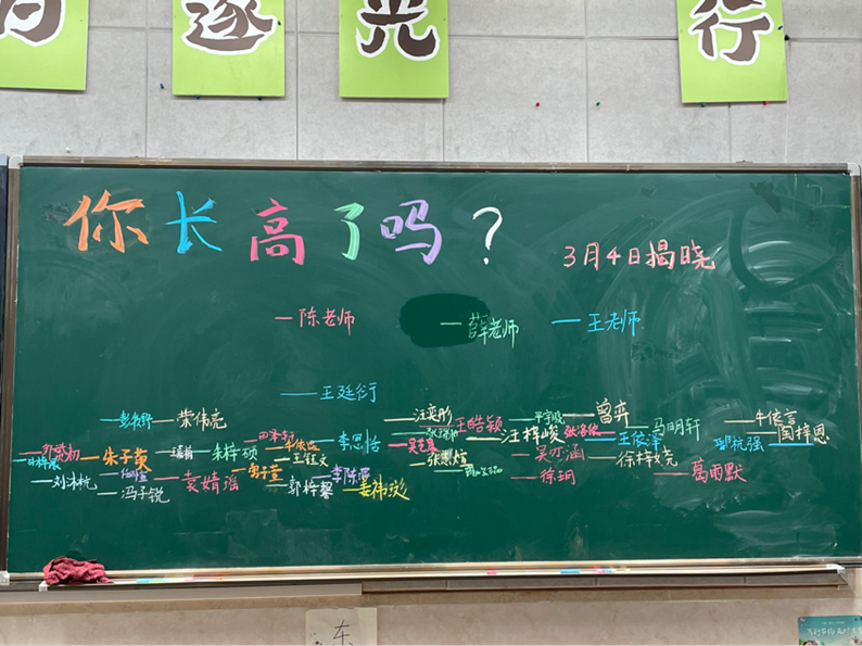 212班教室中,班主任王老师为学生描画身高线,孩子们踮脚张望、对比上学期数据,惊喜地喊着“我长高了3厘米”,简单的线条将“每天进步一点点”的办学理念具象为温暖的成长纪念。