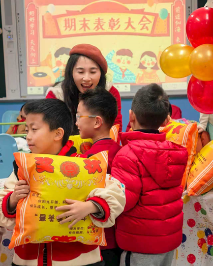 杭州采荷二小教育集团休业式暖心收官。裹红丝带的芹菜、甘蔗、萝卜成“勤勤恳恳”“节节高升”等好彩头拍品,师生竞拍笑闹,将新年吉兆“拍”回家;传统奖状变印字软抱枕,老师亲手递出,让表扬可“抱”可伴睡;还有老师踩着椅子为孩子量身高,并送上“愿宝贝们身高蹭蹭长”的可爱祝福,每个名字旁都标注着成长的刻度。“新春添福”的身高仪式,把成长的痕迹变成了看得见的小骄傲。