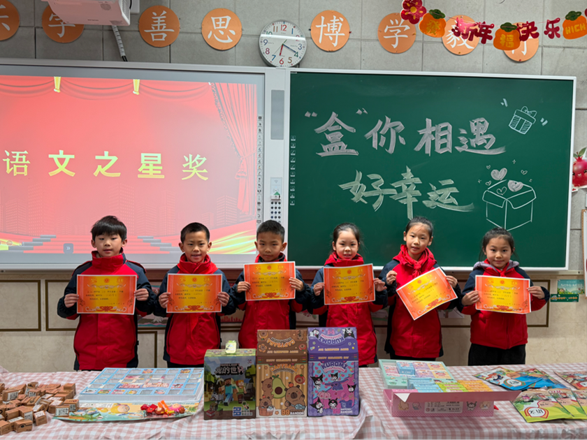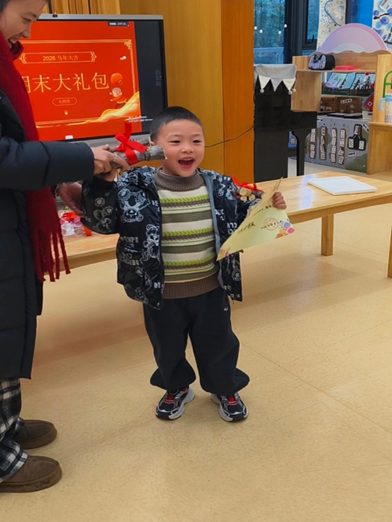 209班的盲盒抽奖点燃全场热情,色彩鲜艳的盲盒里藏着定制书签、卡通文具、“老师亲笔祝福卡”等惊喜,孩子们拆开瞬间欢呼不断,在仪式感中感受班级温暖与新春美好。