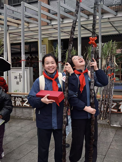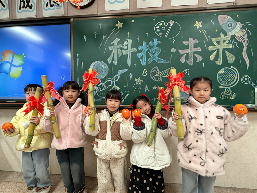 109班的“新春‘甘’甜成长礼”上,翠绿甘蔗系着红丝带送到每位同学手中,寓意“成长节节高,新春甜滋滋”,孩子们捧着甘蔗互相道贺,幸福的笑容里藏着对马年新春的期待。
