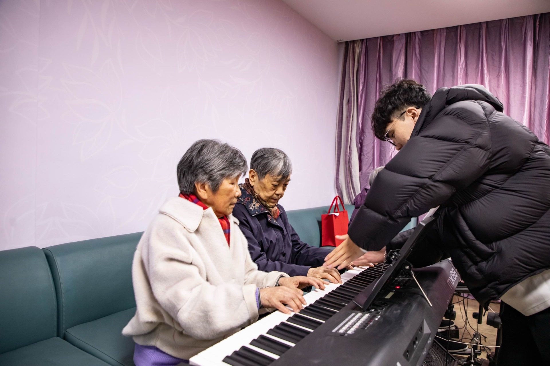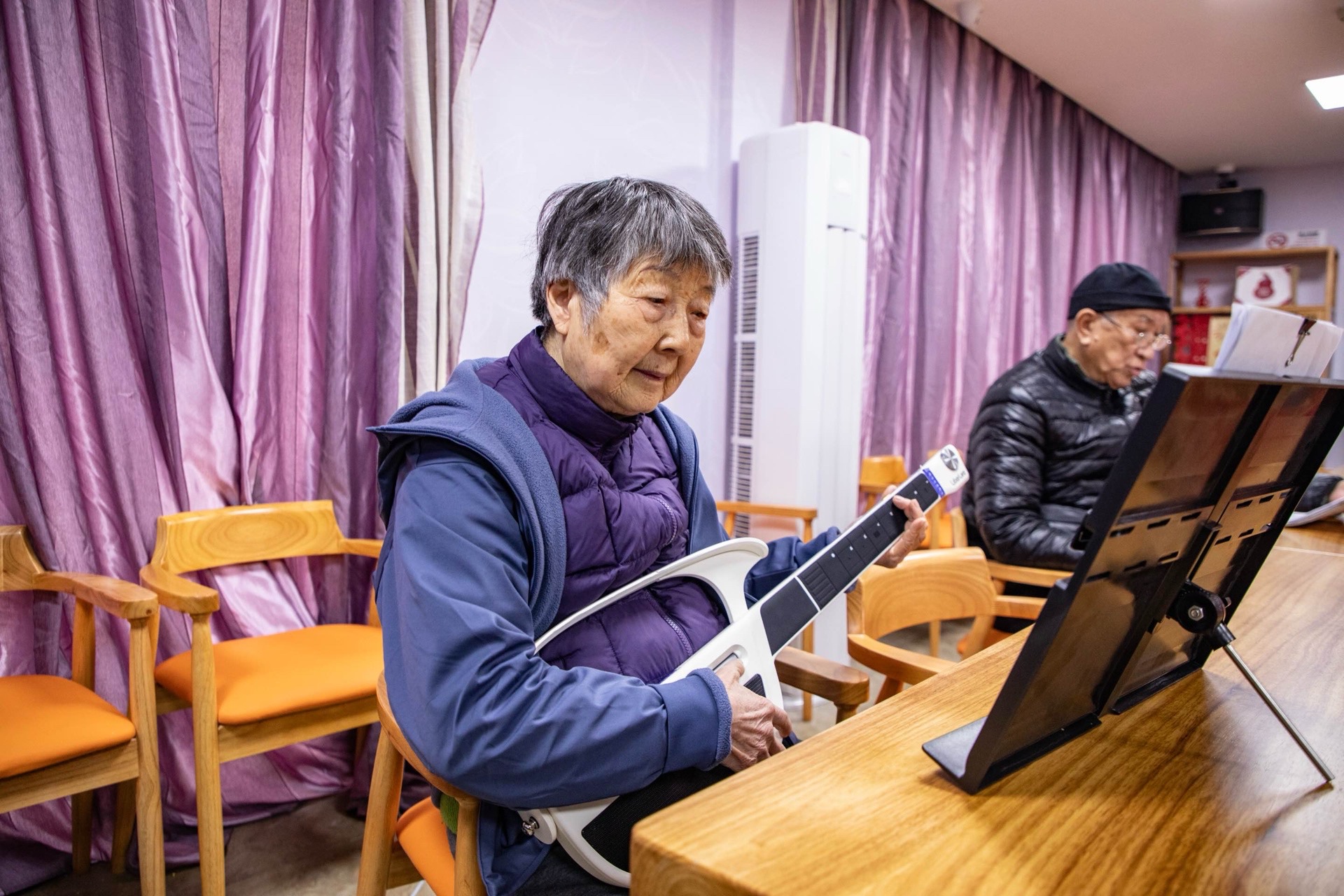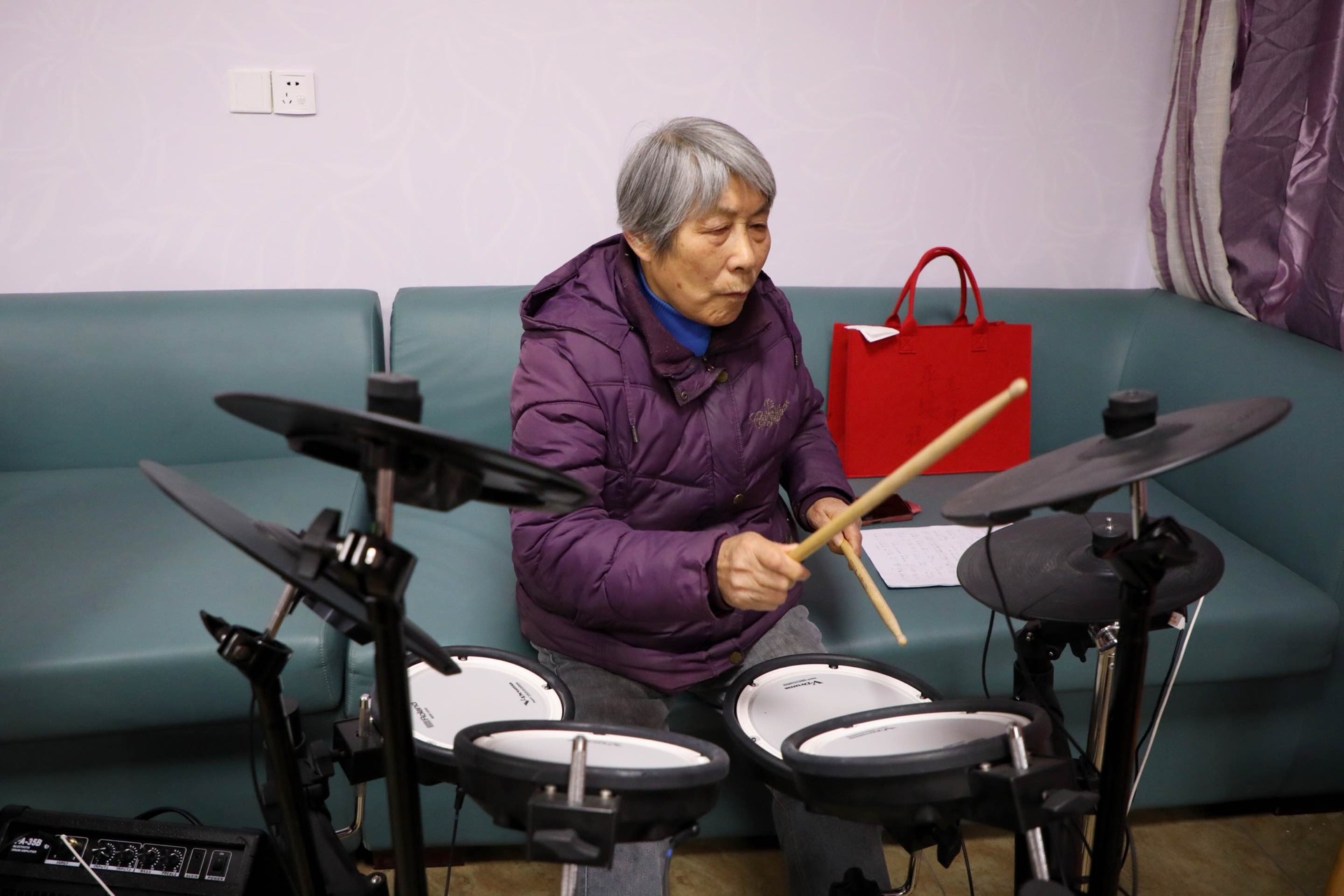 在一旁的沙发上,负责架子鼓的沈奶奶双手持鼓槌,正微微侧耳,仔细聆听节拍。“我们练了一段时间了,就想更熟练些,上台时呈现得更好。”她的话语朴实,但手中的动作一丝不苟。从零基础到能娴熟跟上整首曲子,老人们对待排练的认真劲儿藏在每一个精准的节拍里。