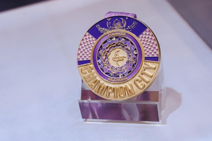 此外,本届赛事的完赛奖牌、参赛服装、主题曲、参赛包、完赛包等已公布。其中奖牌正面以“CHAMPION CITY”为核心,顶部融入河姆渡双鸟朝阳纹这一源自七千年前的文化符号,中间层采用“藻井式”波浪结构,分别对应海港、三江与运河,勾勒出宁波“水韵商都”的城市肌理;背面采用立体波浪纹,模拟三江口水纹律动,营造出“波光粼粼”的视觉效果,寓意跑者如朝阳初升、踏浪前行,在宁波书写属于自己的冠军故事。
