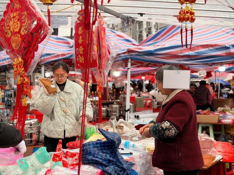 在集市的路边,停着不少浙A牌照的车辆。从杭州赶回来过年的黄女士正带着孩子挑春联。“在外漂了一年,就想回来听听这吆喝声。”她指着摊位上的绒布“福”字,“你看这红,多正!这种热闹劲儿,是刻在骨子里的乡愁。”