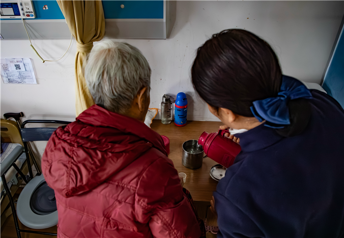 如今,何二华照护的专护房里住着三位老人,81岁的鲁奶奶是其中之一。这天中午,鲁奶奶胃口不佳,筷子迟迟没动。何二华看在眼里,急在心里,她轻轻走到鲁奶奶身边,拿起开胃小菜,温柔地说:“人是铁饭是钢,奶奶多少吃几口,才有力气。”在她的耐心劝说下,鲁奶奶终于露出了笑容,缓缓拿起筷子。