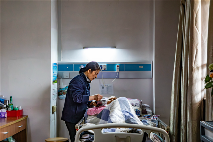 专护房里有一位百岁老人,何二华每次都会俯身轻声呼唤,细心查看卧床奶奶的状况。