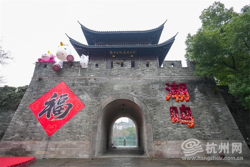 作为杭州古城门珍贵遗存,古庆春门已然成为新春热门打卡地。城门之上,巨型红底福字醒目喜庆,城墙上骏马造型栩栩如生,踏春而来。沿河新春装饰暖意融融,市民们在此赏景闲谈,在古城河畔感受浓浓年味。