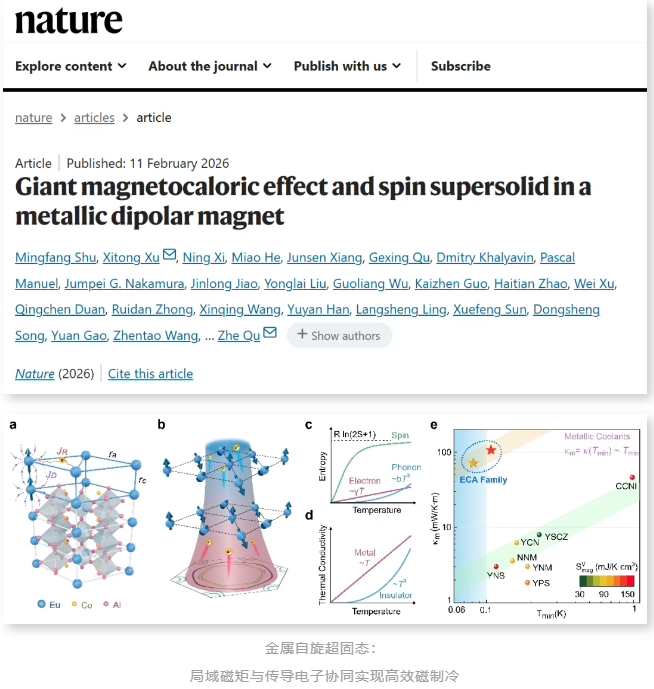 2月11日,国际顶尖学术期刊《Nature》在线发表了以“Giant magnetocaloric effect and spin supersolid in a metallic dipolar magnet”为题的研究成果,首次揭示了“金属自旋超固态”的存在,成功打破极低温固态制冷领域长期存在的性能瓶颈,提出一种不依赖稀缺资源氦‑3的全新制冷技术路线,有望为我国量子测量与计算等关键前沿领域提供自主可控的新型“超级冰箱”,具有重要科学意义与应用价值。